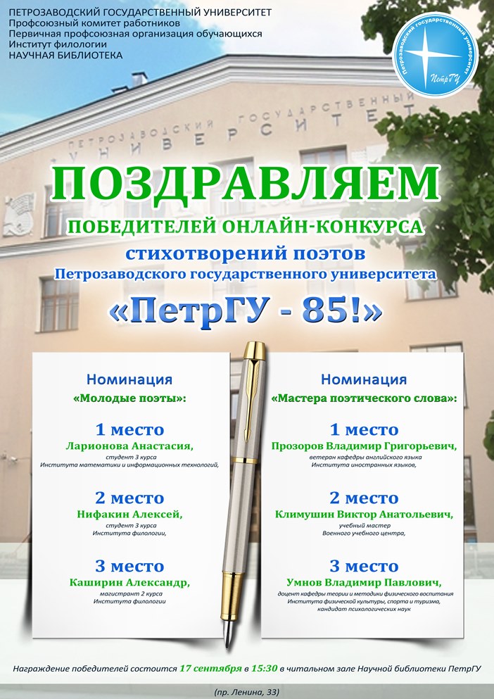 С 3 июня по 10 сентября 2025 г. в Петрозаводском государственном университете состоялся онлайн-конкурс стихотворений "ПетрГУ - 85", посвящённый 85-летнему юбилею со дня основания Петрозаводского государственного университета.