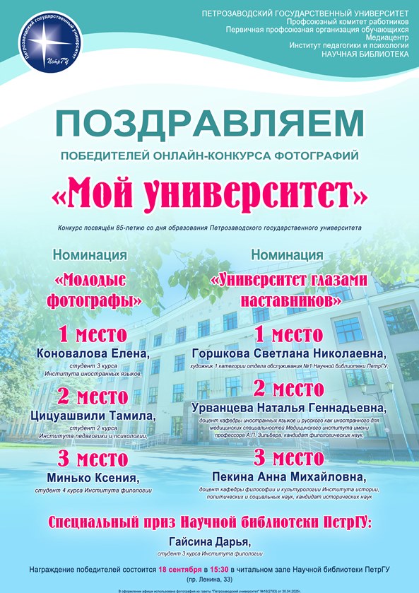 С 4 июня по 10 сентября 2025 г. в Петрозаводском государственном университете состоялся онлайн-конкурс фотографий (фотоконкурс) "Мой университет", посвящённый 85-летнему юбилею со дня основания Петрозаводского государственного университета.