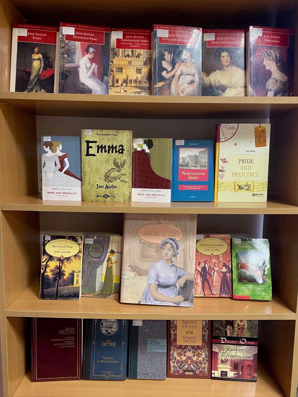 На выставке представлены романы Джейн Остин как на английском, так и на русском языках: "Гордость и предубеждение", "Замок Лесли", "Мэнсфилд-парк", "Чувство и чувствительность", "Эмма" и другие работы писательницы.
