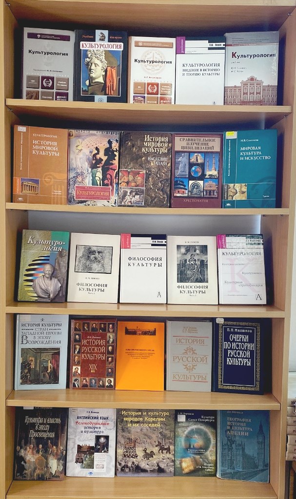 На выставке представлена учебная и научная литература: по культурологи, истории и философии культуры, о культуре Карелии, Великобритании и др. В этих книгах можно найти основные понятия культурологии, типологии культур и главные концепции и направления культурологии, погрузится в культуры разных стран и исторических периодов.