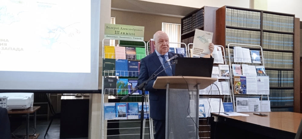 В. А. Шлямин – доктор экономических наук, научный руководитель Института североевропейских и арктических исследований ПетрГУ. Валерий Александрович участвовал в разработке документов стратегического планирования арктических территорий Республики Карелия и проведении Первого научно-практического межрегионального форума с международным участием "Арктика – наш общий дом", который состоялся в Петрозаводске в 2024 году. По итогам форума был издан сборник материалов "Перспективы развития Арктической зоны Российской Федерации в условиях геополитической турбулентности на Севере Европы и в Арктике". Презентация сборника состоялась в читальном зале Научной библиотеки.