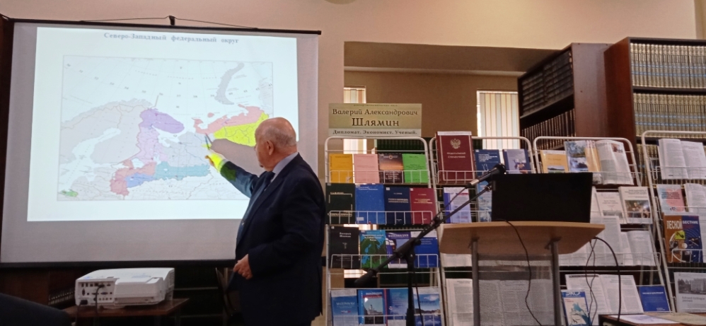 В читальном зале Научной библиотеки Петрозаводского государственного университета состоялась встреча в клубе "Арктика" – открытая лекция "Новые подходы к стратегии развития региона Белого моря в условиях внешних вызовов и угроз" Валерия Александровича Шлямина.