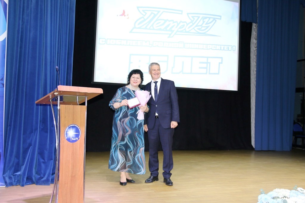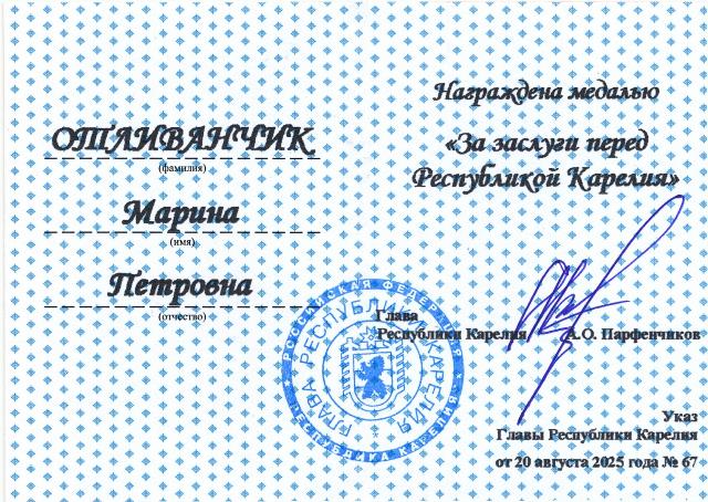 На торжественном заседании Ученого совета Петрозаводского государственного университета Глава Республики Карелия Артур Олегович Парфенчиков вручил директору Научной библиотеки ПетрГУ Марине Петровне Отливанчик медаль "За заслуги перед Республикой Карелия".