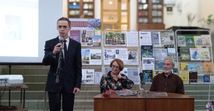 В начале презентации выступил Сергей Лазаревич Чинёнов, сын Лазаря Ивановича Чинёнова, известный художник, рассказал о поездках в село Никольское Орловской области, на родину семьи Чинёновых, и в Сумпосад, родную деревню семьи Смирновых – семьи Лидии Сергеевны Чинёновой, супруги Лазаря Ивановича. С. Л. Чинёнов прочитал стихотворение "Русь советская" С. А. Есенина, любимого поэта Лазаря Ивановича.