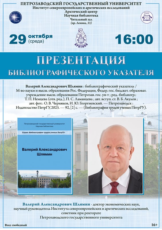 29 октября в 16.00 в читальном зале Научной библиотеки ПетрГУ (пр. Ленина, 33) состоится презентация библиографического указателя Валерий Александрович Шлямин : библиографический указатель / М-во науки и высш. образования Рос. Федерации, Федер. гос. бюджет. образоват. учреждение высш. образования Петрозав. гос. ун-т ; ред.-библиогр.: Т. П. Немцева (отв. ред.), П. С. Ламанцева ; авт. вступ. ст. В. Б. Акулов ; авт. фот.: О. В. Черняков, И. Ю. Георгиевский. — Петрозаводск : Издательство ПетрГУ, 2025. — 92, [2] с. — (Библиография трудов ученых ПетрГУ).