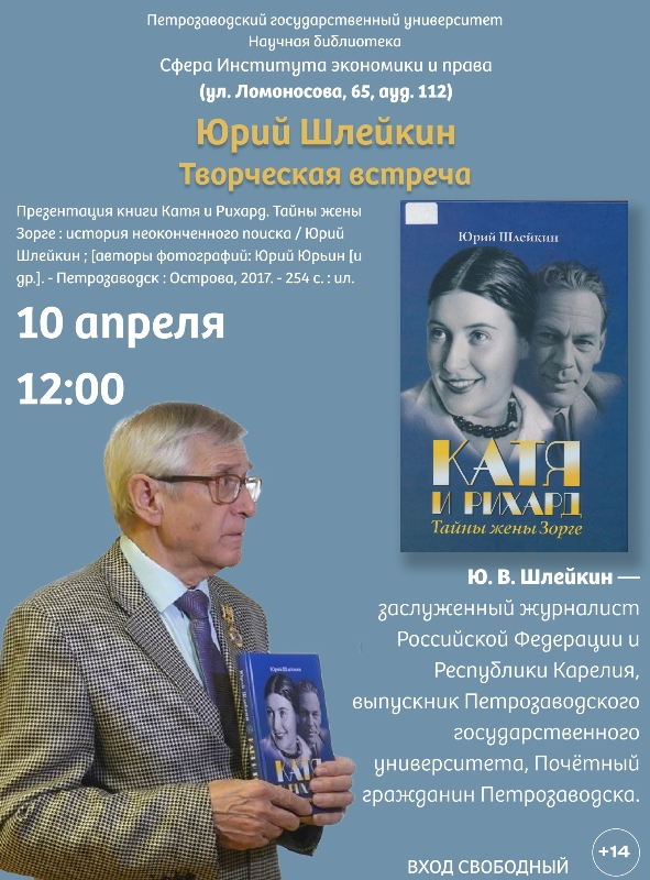 В рамках встречи состоится презентация книги Катя и Рихард. Тайны жены Зорге : история неоконченного поиска / Юрий Шлейкин ; [авторы фотографий: Юрий Юрьин [и др.]. - Петрозаводск : Острова, 2017. - 254 с. : ил.