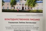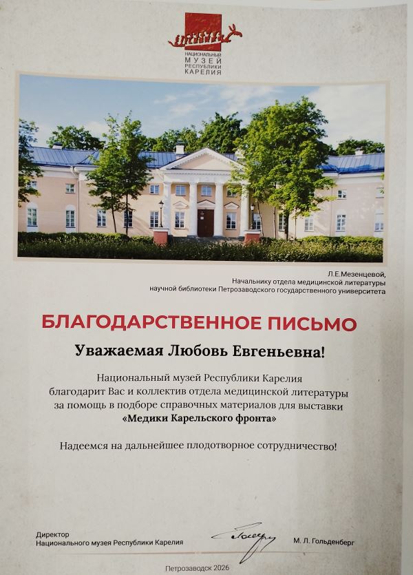 Директор Национального музея Республики Карелия М. Л. Гольденберг наградил Благодарственным письмом начальника отдела медицинской литературы Научной библиотеки ПетрГУ Л. Е. Мезенцеву и ее коллег за помощь в подборе справочных материалов для выставки "Медики Карельского фронта", открытие которой состоялось 7 апреля.