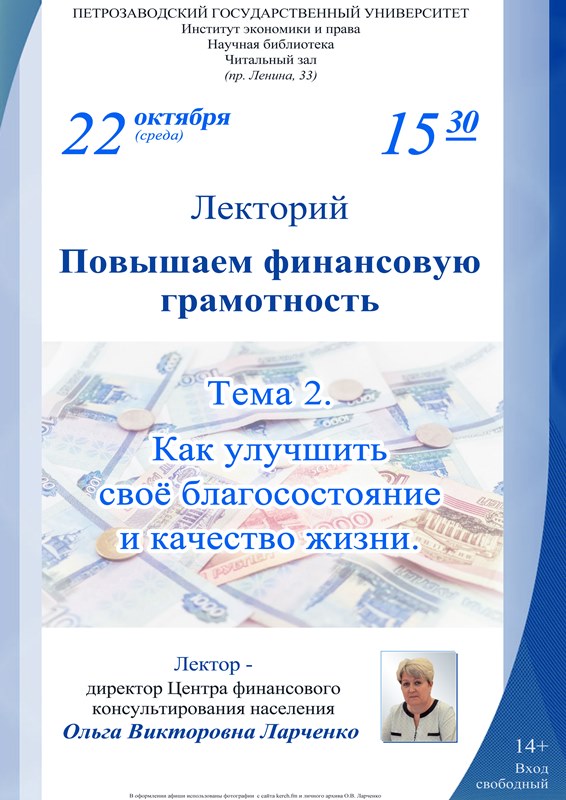 22 октября в 15.30 в читальном зале Научной библиотеки Петрозаводского государственного университета (пр. Ленина, 33) состоится занятие лектория "Повышаем финансовую грамотность".