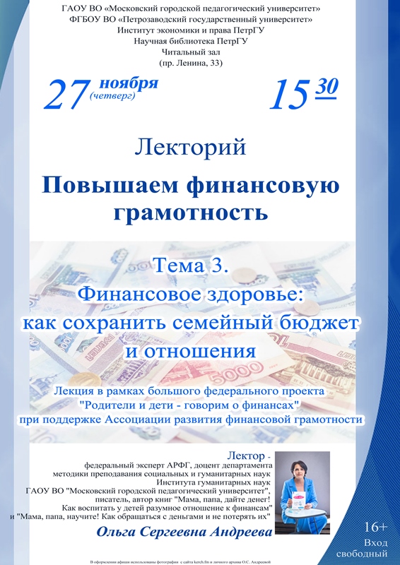 27 ноября в 15.30 в читальном зале Научной библиотеки Петрозаводского государственного университета (пр. Ленина, 33) состоится очередное занятие лектория "Повышаем финансовую грамотность".